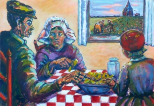 Voor de “Buitenschilderdag 2009” heb ik meegewerkt aan het grote Panoramaschilderij en mocht daarvoor de 'Aardappeleters' schilderen op formaat 2.00 x 1.20 m. Het jaar daarop werden dat de 'Patathappers'.